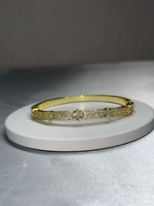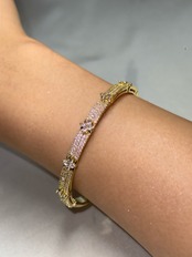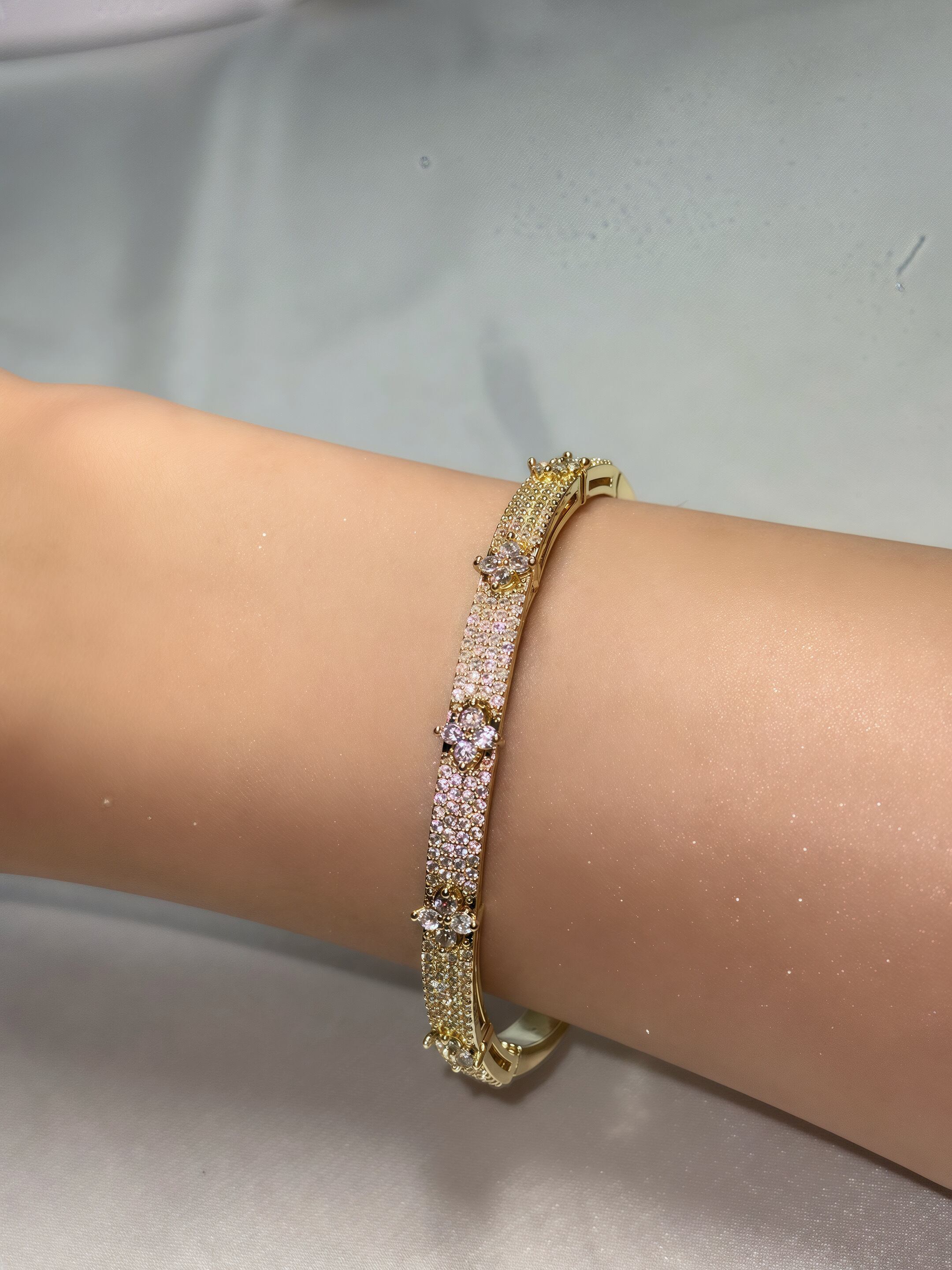 洗練された大人可愛い魅力を持つ、Blossomです。このおしゃれなバングルは、ゴールドのキラキラとした輝きが特徴で、あなたのスタイルに華やかさをプラスします。シンプルでありながら、おしゃれ感溢れるデザインは、デイリーファッションから特別なシーンまで幅広く活躍するアイテムです!手元を素敵に彩るBlossomをぜひご体感ください。